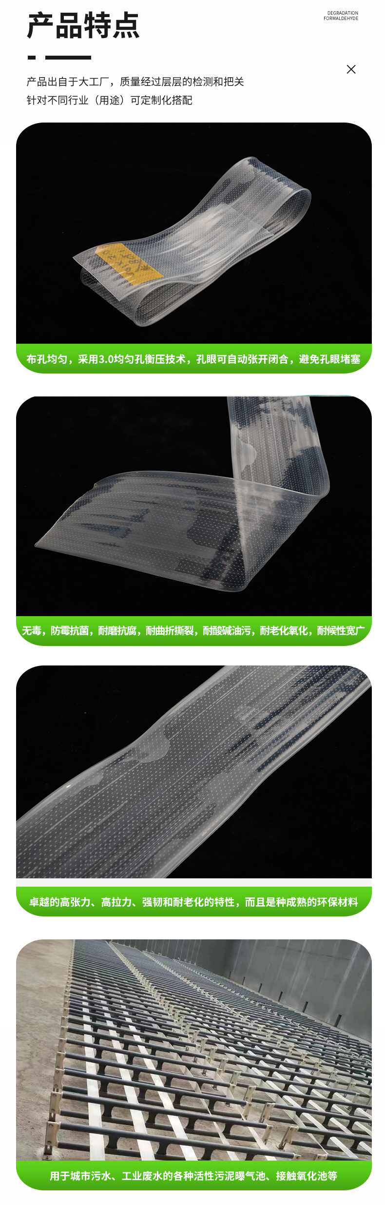 曝氣軟管是引進(jìn)西德技術(shù)開發(fā)成功的新型增氧曝氣器。薄壁、直通道極大降低了曝氣阻力損失;可變孔及狹縫自動開閉,徹底解決了曝氣器的堵塞問題;軟管為線狀曝氣,使布?xì)饩鶆颍⑿纬韶Q向環(huán)流,攪拌混合更均勻;氣泡小,氧利用率和動力效率高。