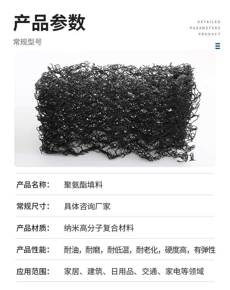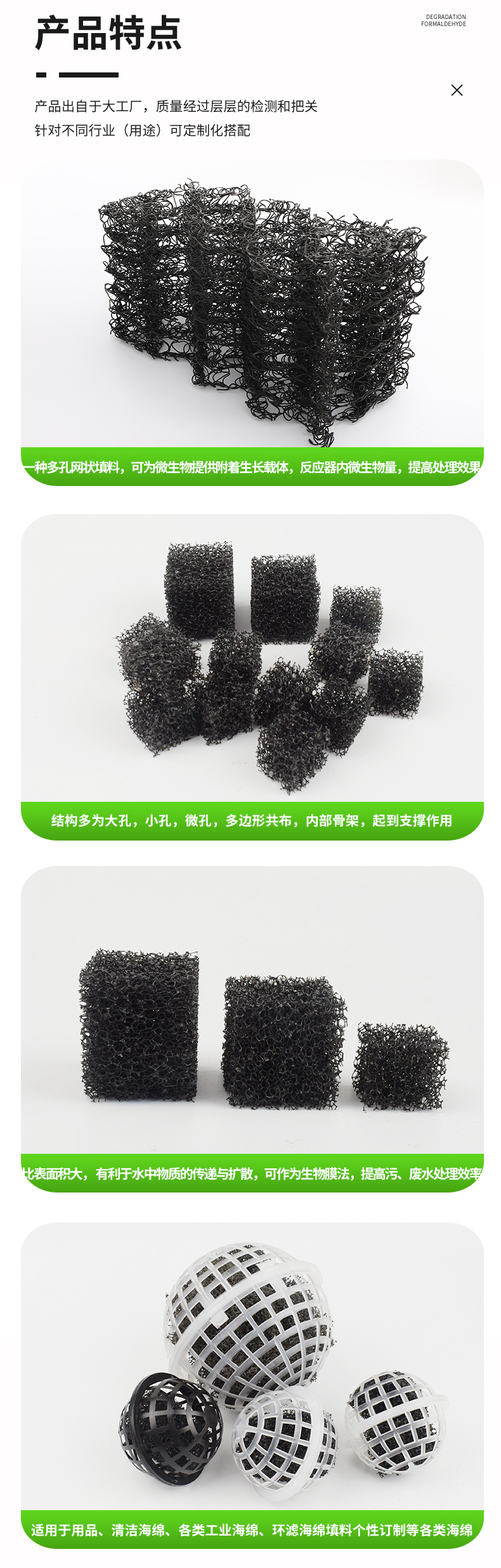 聚氨酯填料作為一種多孔網(wǎng)狀填料,可為微生物提供附著生長(zhǎng)載體,反應(yīng)器內(nèi)微生物量,提高處理效果。聚氨酯填料孔隙為網(wǎng)狀,內(nèi)部具體結(jié)構(gòu)多為大孔,小孔,微孔,多邊形共布,通過經(jīng)絡(luò)使得面與面相交,且構(gòu)成填料的內(nèi)部骨架,起到支撐作用。。聚氨酯填料相比其他填料具有較大的比表面積,孔隙率可達(dá)95%以上,有利于水中物質(zhì)的傳遞與擴(kuò)散,可作為生物膜法,提高污、廢水處理效率,是一種較為理想的生化污水處理填料。