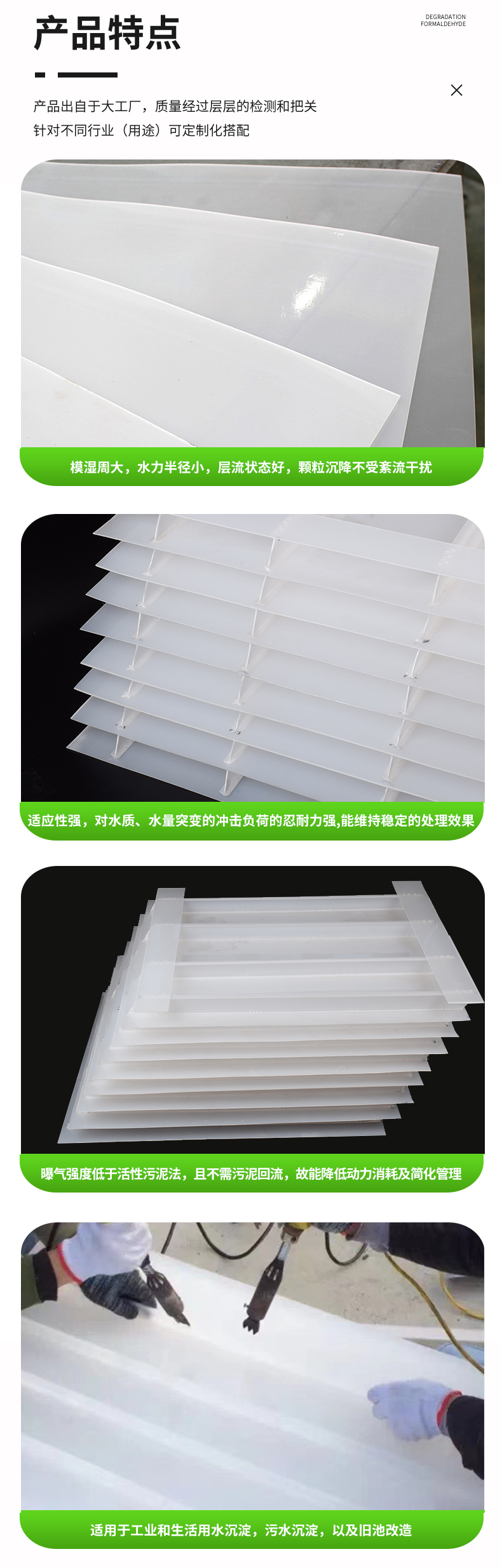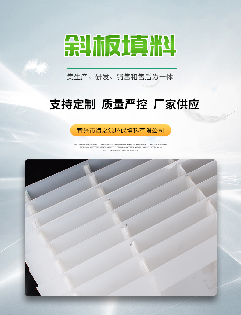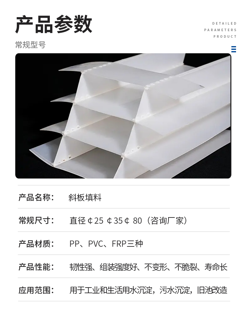斜板填料、乙丙共聚斜板填料、小間距斜板填料主要由乙丙共聚材料加工制成。在淺層理論的基礎(chǔ)上,在斜板上部設(shè)置沉淀距離合理的沉淀段,在下部控制斜板的幾何形狀,使斜板下部形成穩(wěn)定的接觸絮凝段,通過接觸作用和淺池沉淀機(jī)理達(dá)到礬花與水分離的目的。