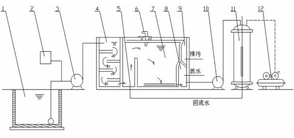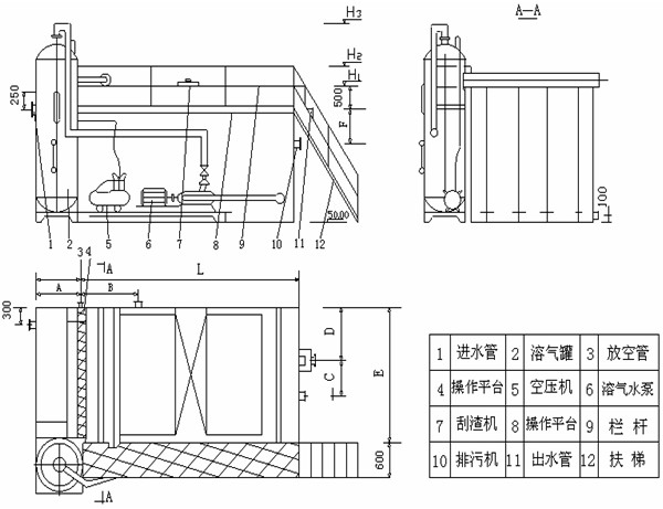 氣浮裝置的工作原理是在一定條件下,將大量空氣溶于水中,形成溶氣水,作為工作介質(zhì),通過釋放器驟然減壓,快速釋放,產(chǎn)生大量微細(xì)氣泡粘附于經(jīng)過混凝反應(yīng)后廢水中的“礬花”上,使絮體上浮,同時(shí)用刮渣機(jī)刮除,從而迅速地除去水中的污染物質(zhì),達(dá)到凈水的目的。 產(chǎn)品特點(diǎn) 1、裝置廣泛應(yīng)用于造紙、印染、制革、電鍍、紡織、石油、化工、食品等相對領(lǐng)域; 2、在給排水處理工藝中對固液、液液和比重近于水的微小懸浮物的進(jìn)行去除; 3、占地面積小,單位面積產(chǎn)水量高,渣體含水率低; 4、溶入的氣體經(jīng)驟然減壓釋放,產(chǎn)生的氣泡不僅微細(xì)、粒度均勻,密度大,而且上浮穩(wěn)定,對液體擾動微小,特別適用于對疏松絮凝體、細(xì)小顆粒的固液分離; 5、加壓條件下,空氣溶解度大,供氣浮用的氣泡數(shù)量多,能夠確保氣浮效果; 6、部分回流式處理效果顯著、穩(wěn)定、并能較大的節(jié)約能耗; 7、工藝過程及設(shè)備簡單、造價(jià)低、便于管理和維護(hù); 8、設(shè)備調(diào)試后,正常運(yùn)行可達(dá)到自動化無人管理狀態(tài)。 適用范圍 1、電鍍廢水重金屬離子,如鉻、鋅、銅、鎳、鉛等總含量在50ppm以下,去除率均70%以上; 2、印染廢水的色度去除達(dá)90%左右,COD去除率達(dá)60~70%左右,BOD去除率達(dá)50%左右; 3、食品屠宰和制革廢水的COD去除率達(dá)70%左右,懸浮固體去除率達(dá)90%左右; 4、煉油廢水的油脂,可降到10mg/L以下,廢水能達(dá)到澄清程度; 5、對化工廢水和顏料油漆等,COD去除率達(dá)74%,色度去除率達(dá)93%左右; 6、造紙白水的纖維回收率可達(dá)95%左右,COD去除率達(dá)86.7%左右,清水完全回用; 7、大池沐浴水濁度可穩(wěn)定在10℃以下,水中的細(xì)菌有較大幅度下降; 8、生活飲用水及工業(yè)的濁度可凈化的5℃以下,同時(shí)對色度耗氧量降低有良好的效果。 工藝說明 本設(shè)備的工作方法屬于加壓溶氣氣浮法,其工作原理:在一定條件下,將大量的空氣溶于水,形成溶氣水,作為工作介質(zhì),通過釋放驟然減壓,快速釋放,產(chǎn)生大量的微細(xì)氣泡,粘附于經(jīng)過混凝反應(yīng)后的廢水中的"礬花"上,使絮體上浮進(jìn)行清除。 1. 調(diào)節(jié)池 2. 投凝劑設(shè)備 3. 污水泵 4. 折板聚凝池 5. 釋放器 6. 刮渣機(jī) 7. 氣浮池 8. 溶氣水存放池 9. 污泥池 10. 溶氣水泵 11. 溶氣罐 12. 空壓機(jī)