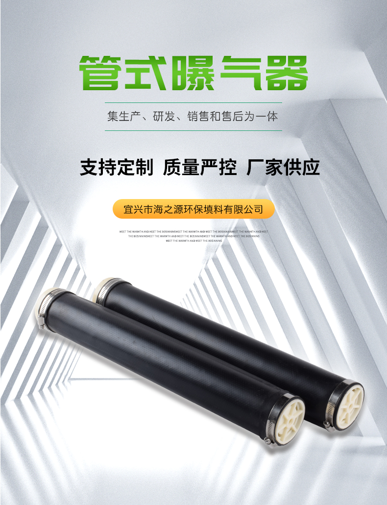 管式曝氣器構(gòu)造:曝氣膜片、支撐管、空氣管道。管式曝氣器外徑69mm,常規(guī)為580mm、800mm和1000mm。長度在580mm一下采用擠出或模壓成型,長度大于580mm采用擠出成型。膜管上一1.5mm大小、2×2.5mm的間距打孔,能產(chǎn)生直徑1-3mm的均勻微小氣泡膜管頂部有15mm長無氣孔區(qū),當(dāng)終斷供氣時膜片立即恢復(fù)原狀。對空氣入口起自動防逆流作用。