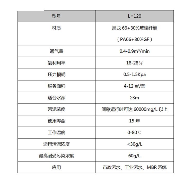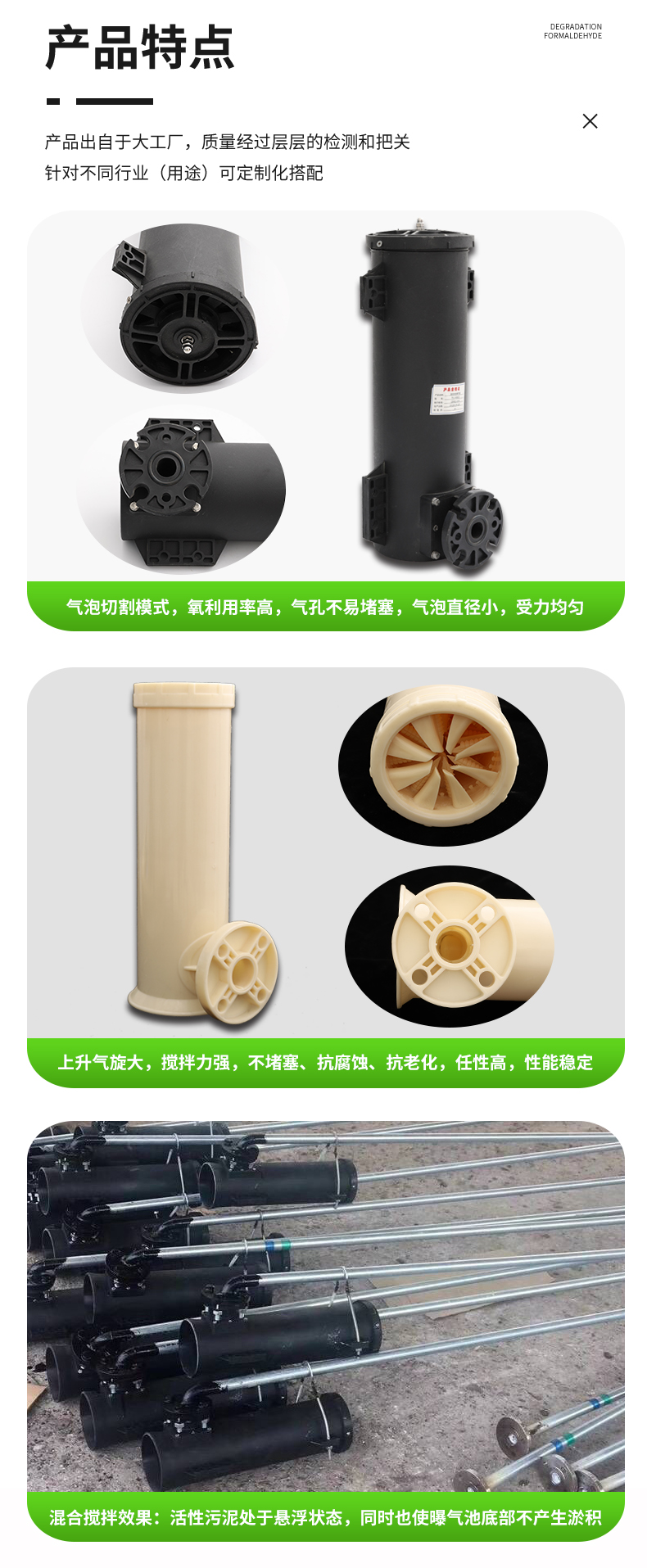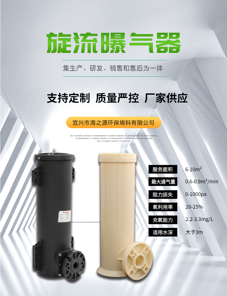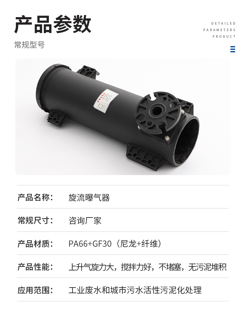 可升降旋流曝氣器整體由尼龍66+30%玻璃纖維制成,,具有較高的耐腐蝕性。其高度為42厘米,內(nèi)徑為12厘米,進(jìn)氣口中心距曝氣頭底部5厘米。
