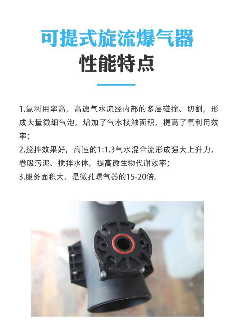 旋流曝氣器主要由外筒、進(jìn)氣管、回流板、楔形結(jié)構(gòu)四部分組成,可提升旋流曝氣器溶氧效率高,壓力損失小,攪拌能力強(qiáng),不堵塞,池底不積泥,,免維護(hù),間歇運(yùn)行,使用壽命長(zhǎng);與傳統(tǒng)的螺旋曝氣器、發(fā)散式曝氣器、穿孔管曝氣器相比,可升降旋流曝氣器的能耗可降低25%以上。