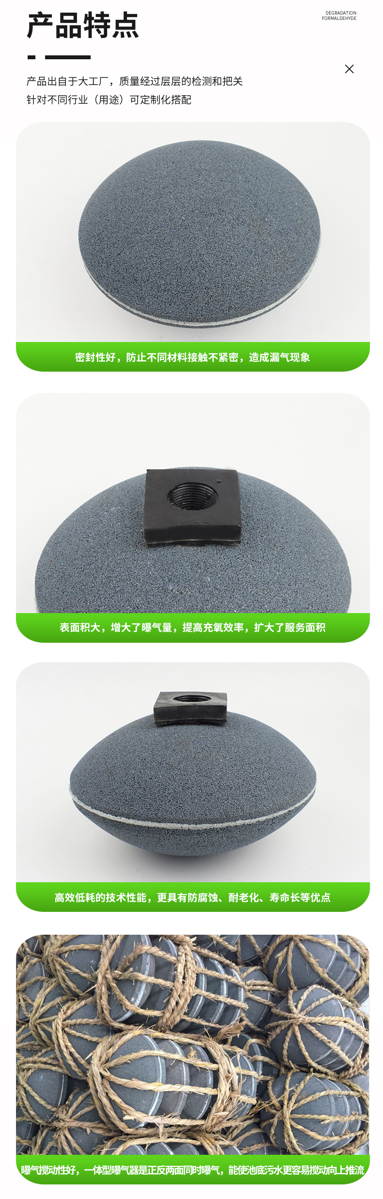 陶瓷剛玉曝氣器是以棕剛玉沙為主要原料,經(jīng)壓制成型、高溫?zé)Y(jié)的一種鐘罩型高效節(jié)能空氣擴(kuò)散裝置,該類型曝氣器硬度更大,化學(xué)性能十分穩(wěn)定,可適用于各種生活污水和工業(yè)廢水生化處理、水產(chǎn)養(yǎng)殖等增氧系統(tǒng)。分全剛玉和半剛玉兩個類型。它與其它類型曝氣器相比,運(yùn)行穩(wěn)定、耐老化、防腐蝕、適用于連續(xù)曝氣池運(yùn)行等特點(diǎn)給該產(chǎn)品營造了較為理想的市場空間。