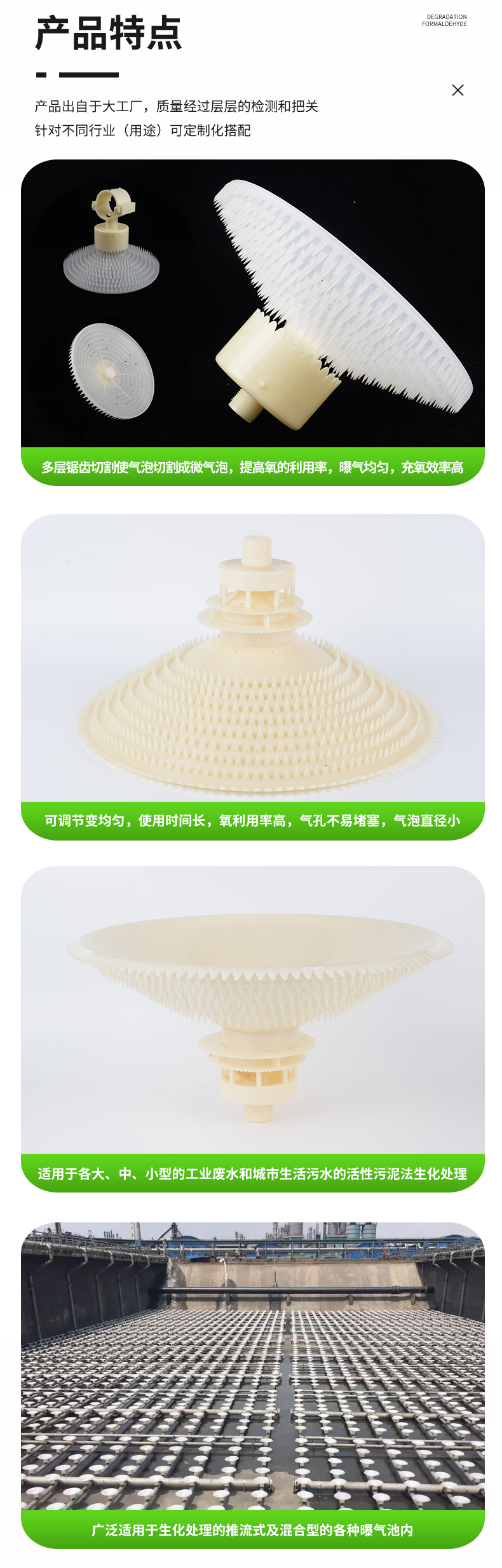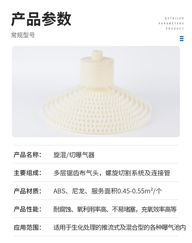 旋混式曝氣器采用多層螺旋切割的型式進(jìn)行充氧曝氣,旋混式曝氣器當(dāng)氣流進(jìn)入260型混流型曝氣器時,氣流首先通過二道螺旋切割系統(tǒng),切割后進(jìn)入下層的的多層鋸齒型布?xì)忸^,進(jìn)行多層切割,使氣泡切割成微氣泡,這樣大大提高了氧的利用率,具有布?xì)饩鶆颍溲跣矢叩奶攸c。