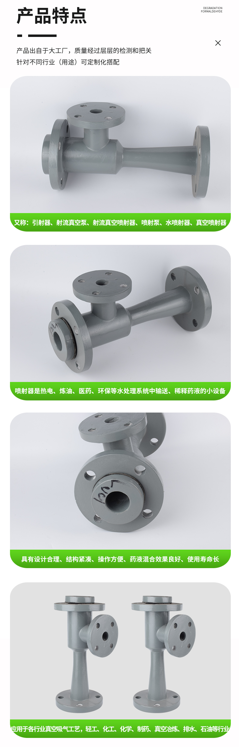 噴射器--原WGP型,適用藥液:鹽酸、堿 。噴射器是熱電、煉油、醫(yī)藥、環(huán)保等水處理系統(tǒng)中輸送、稀釋藥液的小設(shè)備,具有設(shè)計合理、結(jié)構(gòu)緊湊、操作方便、藥液混合效果良好、使用壽命長等優(yōu)點。調(diào)節(jié)濃藥液進口閥門及調(diào)節(jié)墊片的厚度,使出口藥液達到所要濃度。注意:安裝時需要特別注意噴射器法蘭與鐵法蘭之間的平行度和垂直度。